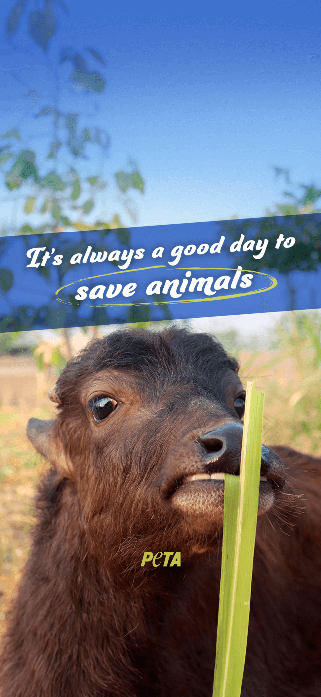 Bansi the baby water buffalo, Cody the llama, and Jaya the horse (who gave birth to a colt, Rudi, days after she was found) are just a few of the animals who were rescued by PETA or another PETA entity and brought to sanctuaries where they receive gentle care, nutritious food, and the respect they deserve.