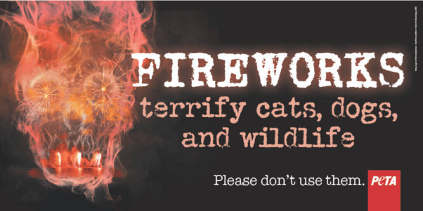 PETA points out that in addition to inflicting terror on both wild and companion animals, fireworks also dump pollution into the environment and can severely affect people with sensory issues and those suffering from post-traumatic stress disorder.