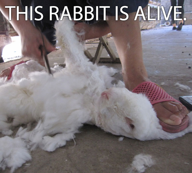 A PETA Asia eyewitness visited rabbit farms in China, the source of 90 percent of the world’s angora wool, and found rabbits who screamed in pain and terror as workers ripped the fur out of their skin, a barbaric ordeal that they endure every three months. Rabbits who are sheared have their feet tightly tethered, and they are suspended in the air or stretched across boards. The sharp cutting tools inevitably wound them as they struggle to escape. After several years, rabbits who survive this repeated abuse are hung upside down, and their throats are slit.