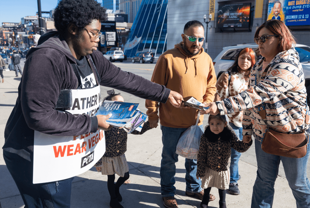 Each year on the largest shopping day of the season, we demonstrate that fashion does not have to come at the cost of animal suffering at multiple “Free the Animals” Friday events nationwide.