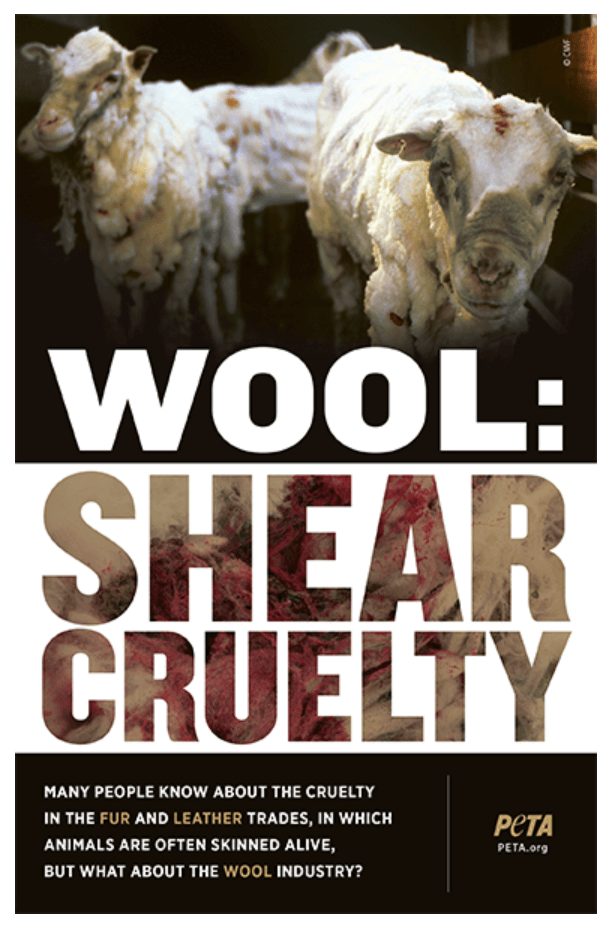 • Many people have no idea that in the wool industry, sheep are routinely kicked, beaten, and cut to shreds while being shorn and then killed when they’re no longer useful. They endure this abuse even on farms that claim to be “sustainable” and “responsible.”