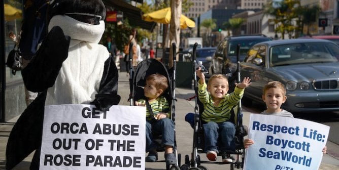 PETA supporters protest SeaWorld’s planned Rose Parade float.