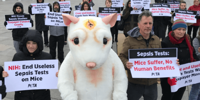Folks passing by were horrified by video footage showing mice stitched together—for cruel and useless sepsis experiments.