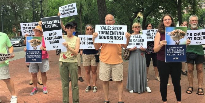 Outside a Southern California conference, PETA called on Christine Lattin to end cruel chronic-stress experiments on wild songbirds.