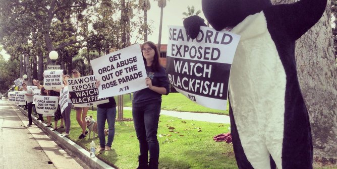 PETA supporters protest SeaWorld’s planned Rose Parade float.