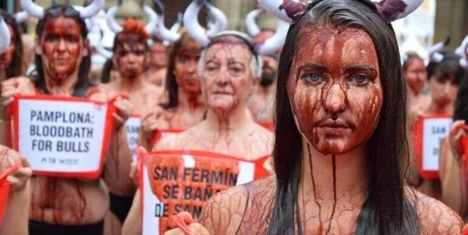 Dozens of people from all over the world took part in a “bloody” protest against bullfighting and the Running of the Bulls.