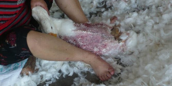 A PETA “goose” tells the home goods retailer why feathers look best on their rightful owner.