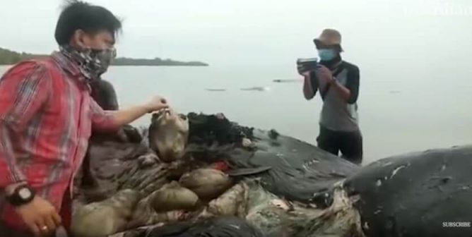 Dead Whale Ingested Plastic Bottles, Bags, Flip-Flops, and 115 Cups