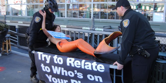 “Tiffany Tuna” gives out faux fish near Fisherman’s Wharf in San Francisco to call attention to PETA’s newest “Try Vegan” ad.