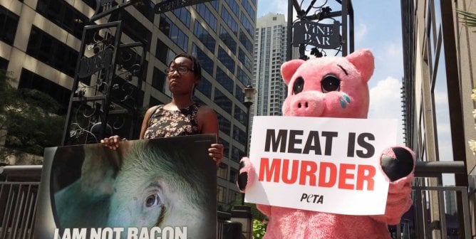After yet another exposé of meat-industry animal abuse, PETA animals converge on The Purple Pig to demand change.