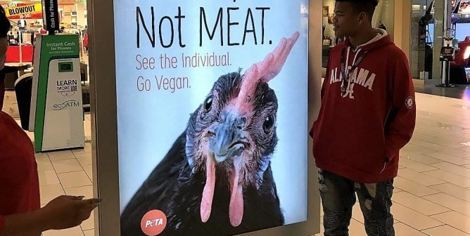 A PETA “goose” tells the home goods retailer why feathers look best on their rightful owner.