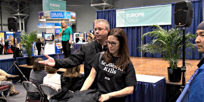 As the park trotted out several captive wild animals, six PETA members wearing “SeaWorld Kills” T-shirts rose, walked to the stage, and stood in silent protest.