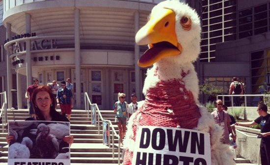 A PETA member dressed as a giant 8-foot-tall half-plucked goose ruffled some feathers to expose the cruelty behind the down industry.