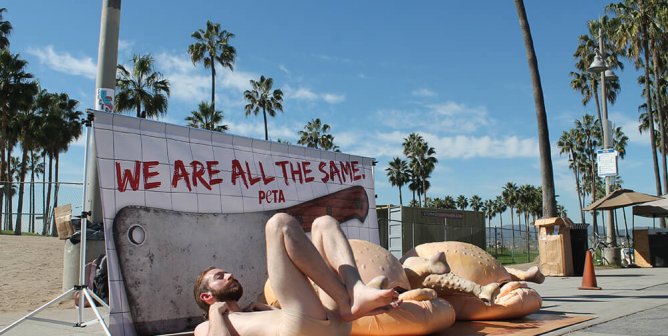 A PETA member lies on a giant dish at the event to urge people to relate to who’s on their plate.