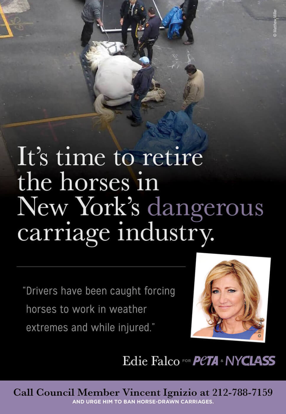 From her award-winning roles on The Sopranos and Nurse Jackie and this year’s Law & Order True Crime: The Menendez Murders to her defense of animal rights, Edie Falco speaks her mind on screen and off. She has spoken passionately against horse-drawn carriages, the abuse of elephants in circuses, and SeaWorld’s cruelty to orcas. The longtime vegan has also traveled several times to Washington, D.C., on PETA’s behalf to urge members of Congress to support legislation that would end cruel military trauma training exercises in which animals are stabbed, shot, and killed.