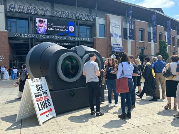 PETA brought our massive binocular installation, “How the Other Half Lives,” to Husky Stadium for the University of Washington’s commencement ceremony, encouraging thousands of attendees to view the horrors monkeys endure at the school’s nearby Washington National Primate Research Center. PETA’s “monkey” mascot Dorothy, along with advocates from the Northwest Animal Rights Network, spoke with attendees and distributed hundreds of leaflets and stickers.