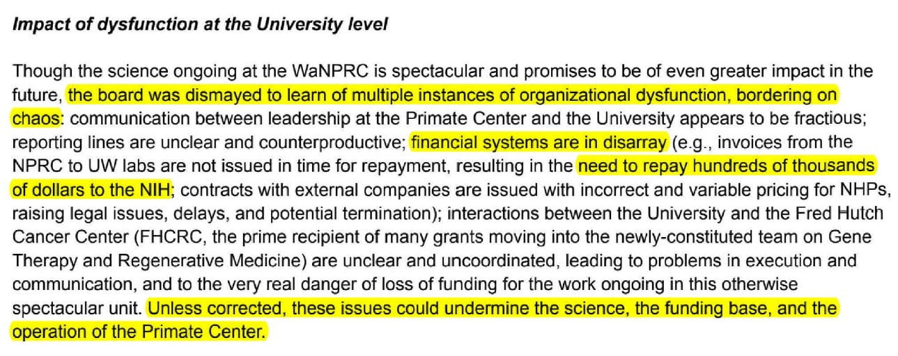 The 2024 report was penned by the National Scientific Advisory Board, an independent panel of senior scientists from other institutions, as required by NIH, tasked with evaluating the primate center’s performance. It warns of fiscal operations in “disarray,” staffing instability, disorganized oversight, strained partnerships jeopardizing NIH-funded projects, and outbreaks of disease at the center’s breeding facility in Arizona.