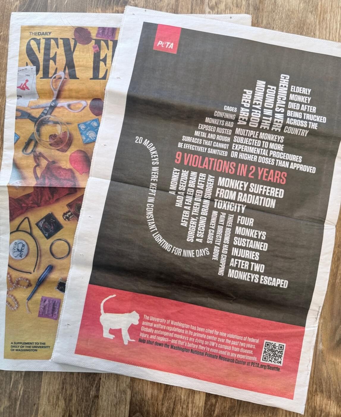 PETA slammed the University of Washington for violating bare minimum animal welfare standards nine times in the past two years with a back-cover ad in the school’s newspaper, The Daily.