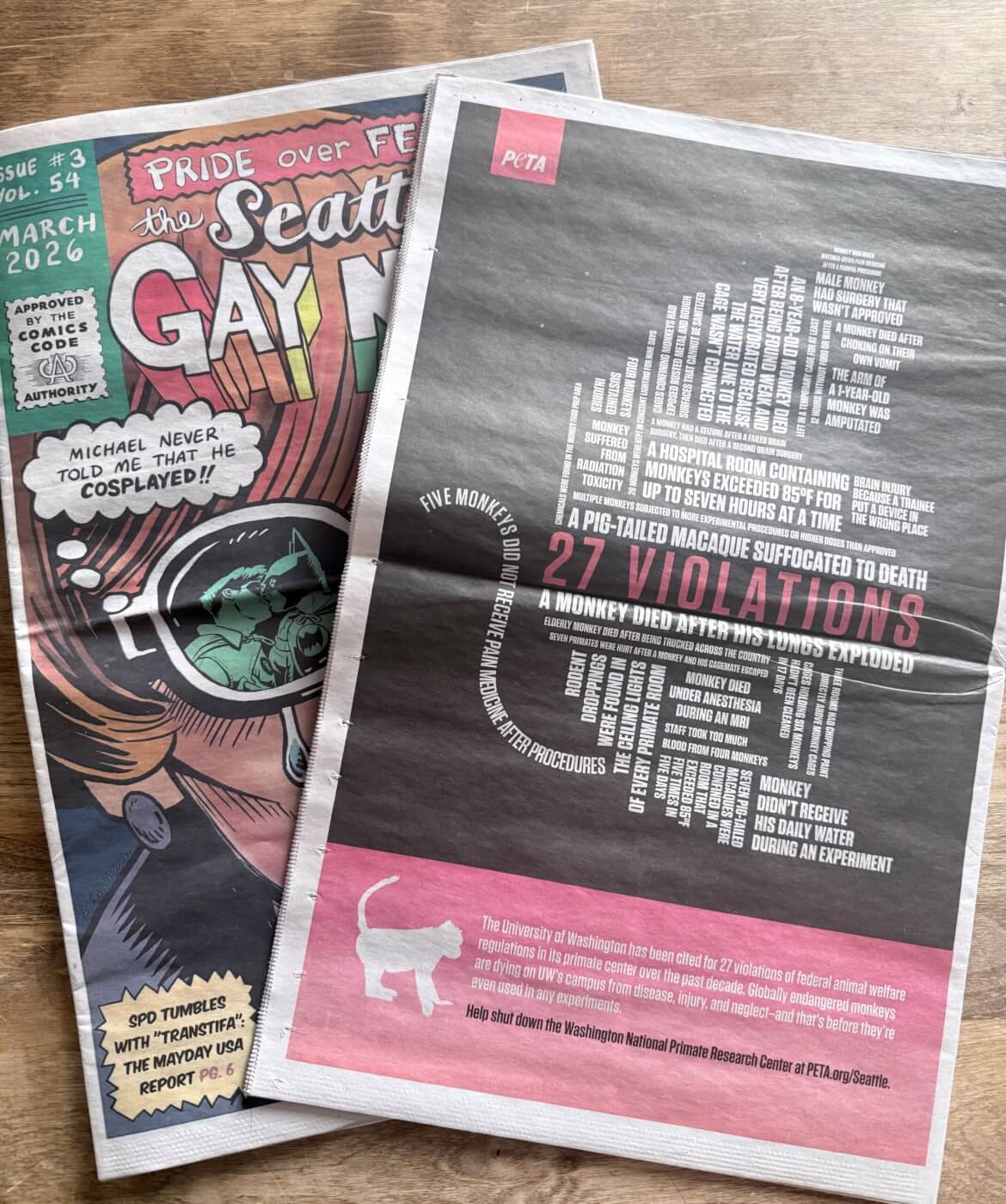 A striking back-cover ad in the Seattle Gay News trumpeted the University of Washington’s 27 federal Animal Welfare Act violations that it has racked up over the past decade at its facilities in Seattle and Mesa, Arizona