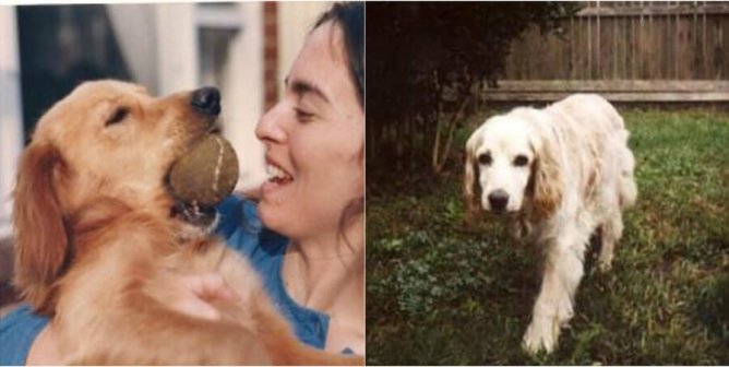 Touching before-and-after photos show young pups and the dear older dogs they matured into over a lifetime of tender, loving care.