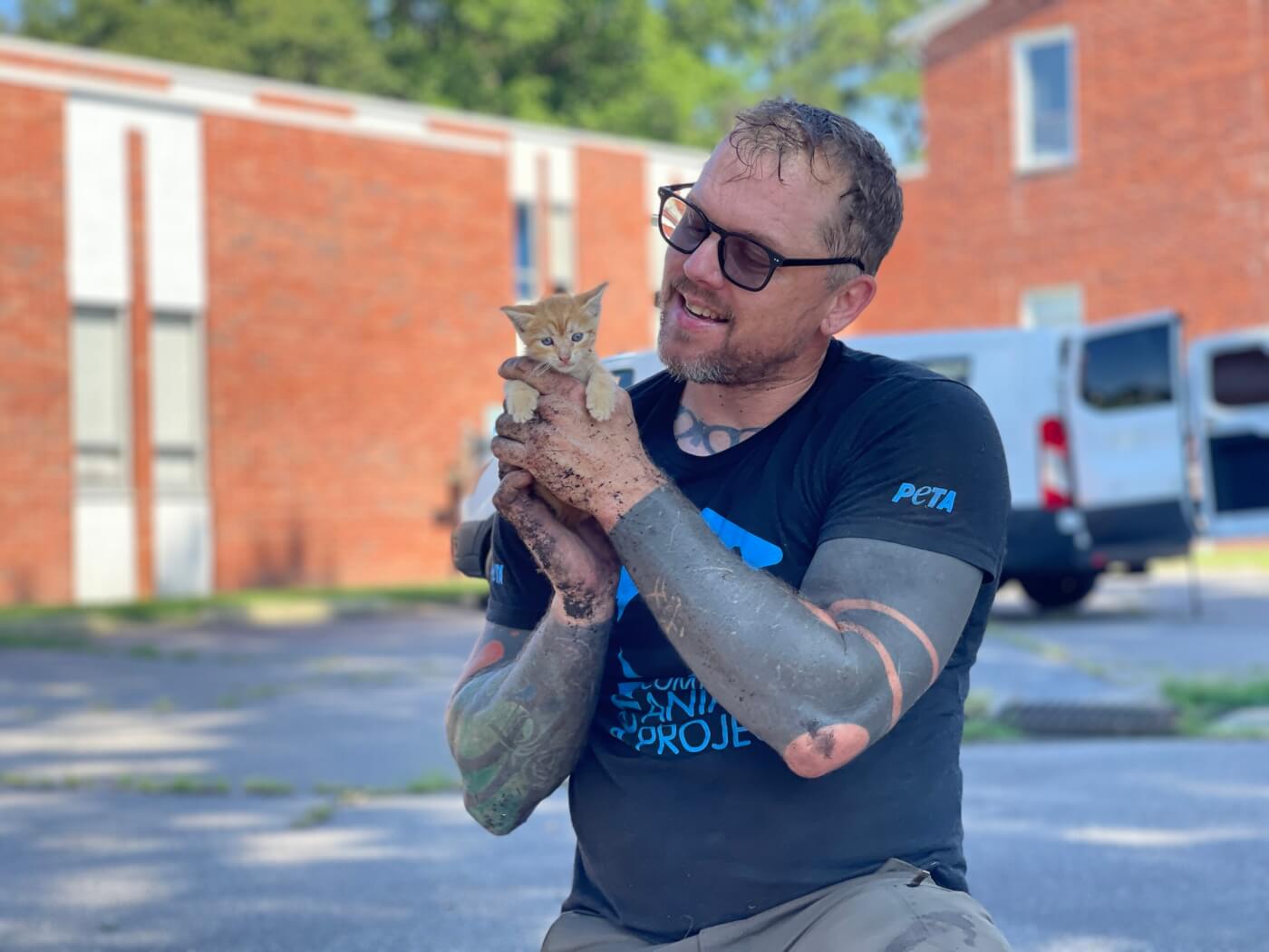 With the animals’ owners not home and unresponsive to PETA’s repeated calls and texts, the fieldworkers ensured the tiny tabby had food and water—as they had previously for the dogs on the property—and made plans to return immediately.
