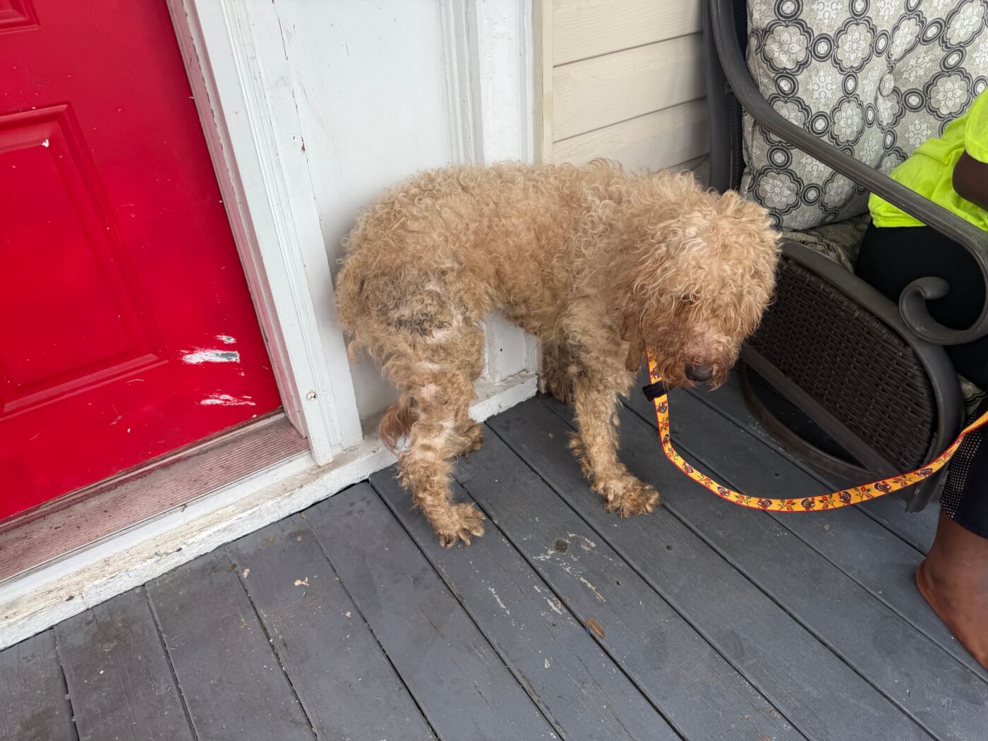 Keke—a terrified goldendoodle, whose curls were matted and urine-stained from being constantly crated amid her own urine and feces—cowered on the front porch. The PETA fieldworkers who responded to the call were nearly overwhelmed by the stench of ammonia emanating from the house and from Keke’s hair, which hit them, in their words, “like a freight train.”