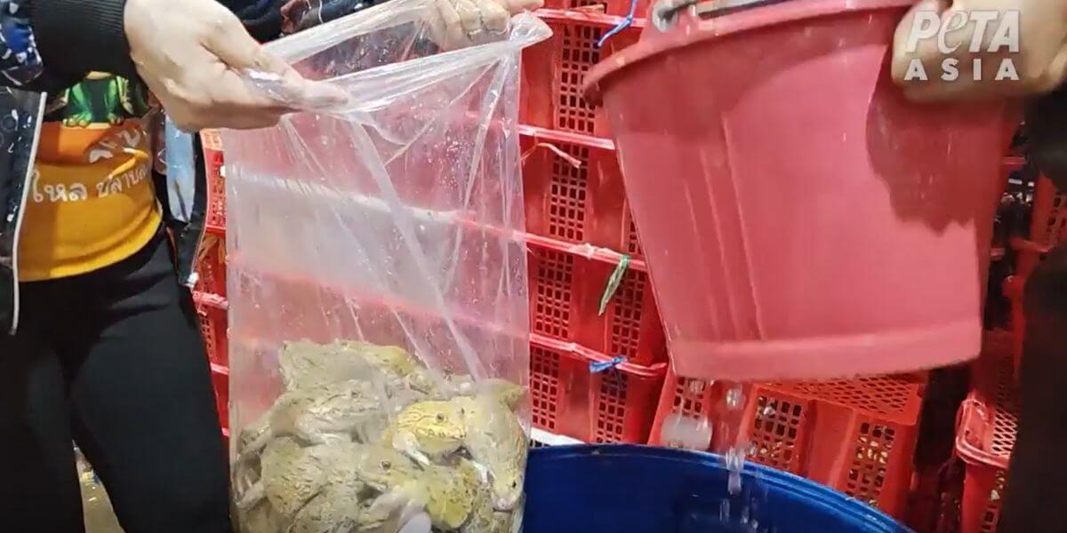 PETA Asia’s new undercover footage from Thailand shows workers cramming frogs into plastic bags filled with ice-cold water, slowly suffocating them for up to 12 hours before slaughter.