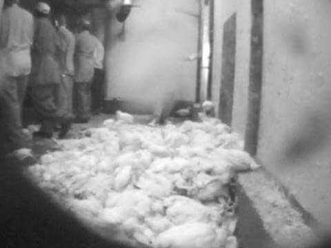 During an investigation at a KFC “Supplier of the Year” in Missouri it was documented that birds were being thrown by workers and crushed by metal dumping machines.