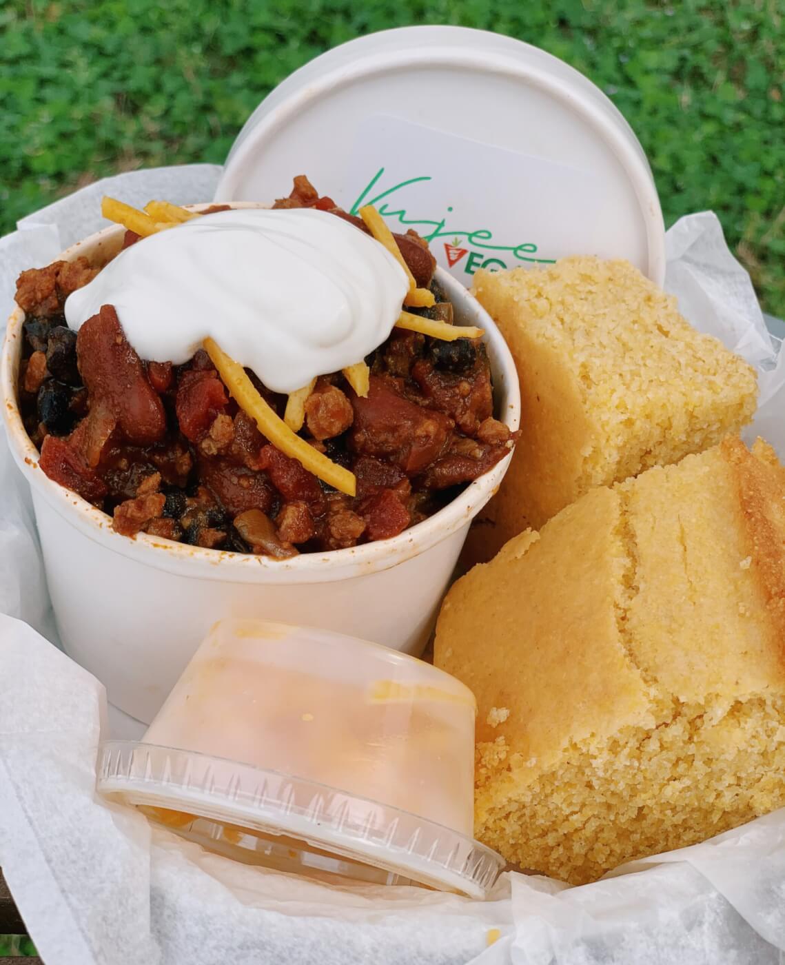 Vujee Vegan is a community favorite in Huntsville thanks to its generous servings, bold flavors, and fully animal-free menu. Its signature Vujee Homemade Chili is one of its most popular dishes for good reason. This award-winning bowl combines beefless crumbles with kidney and black beans, onions, and the restaurant’s special spice blend, creating a robust, savory chili. Each serving is topped with vegan sour cream and cheeze and paired with a side of sweet cornbread, making it a full comfort-food experience.