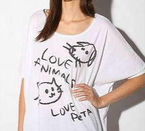 Urban Outfitters describes this trendy tee: “Soft knit tee cut long in a loose, drapey fit with a scoopneck and dolman sleeves. Topped with a PETA graphic at the front.”