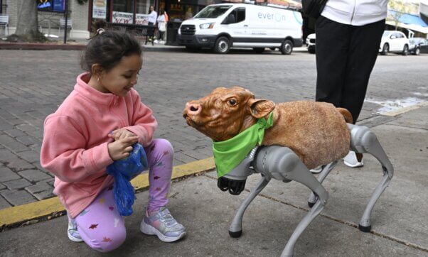 Taking our skin-free plea from the catwalk to the sidewalk, stars Caylee Cowan, Griffin Maxwell Brooks, Sara Camposarcone, and Ameya Okamoto posed nearly nude in the windows of Stella McCartney’s flagship store and around New York City with signs proclaiming, “We’d rather go naked than wear leather!” PETA’s AI-powered robot calf, Charli XC Cow, has been popping up everywhere, making shoppers do a double-take as she asks, “Are you wearing my mother?” Charli even made an appearance on The Late Show with Stephen Colbert when the host shared her picture and mentioned that she “inform[s] shoppers of the mutilations and violent deaths that are behind every leather jacket.”