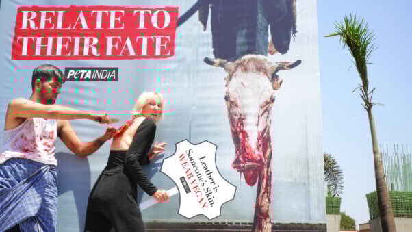 PETA Principal Ingrid Newkirk took the message to India – where PETA entity investigations have shown workers breaking cows’ tails and rubbing chili peppers into their eyes – turning heads as she was “skinned alive” in front of a “slaughterhouse” in Mumbai. PETA Germany’s investigation in neighboring Bangladesh revealed cows kicking out as their skin was torn off and child tannery workers standing in toxic chemicals.