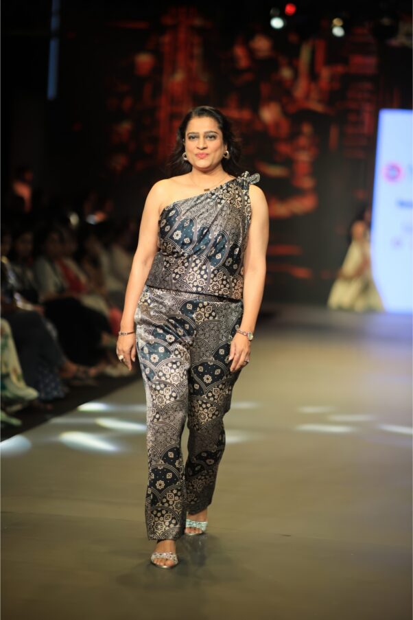 Indian actor Ekta Jain radiates easy luxury in silk separates derived from wood pulp at a fashion show curated by designer Soumalika Ghosh and Archana Jain.