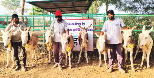 There are many Karunas in Maharashtra, India, where PETA President Ingrid Newkirk founded Animal Rahat, a PETA-supported veterinary service and rescue organization, but this Karuna’s lucky day was about to arrive. She and the 22 other donkeys at “her” brick kiln – five of them expectant mothers – were swapped out for tractors! Off they went to one of Animal Rahat’s sanctuaries, where Karuna’s daughter, Doshi, was born, joining the happy family of rescued donkeys.
