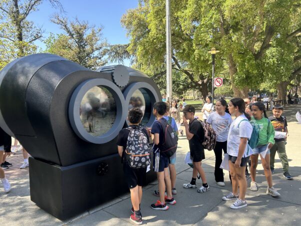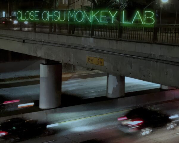 Our 7-foot-tall “binoculars” traveled to the Oregon university’s campus, the state capitol, and other locales to let people contrast monkeys living happily in their natural homes in one lens with a close-up view of the privation they endure in laboratory cages through the other. Over Portland’s busiest freeway, our neon sign lit up the night with a searing demand: “CLOSE OHSU MONKEY LAB.” Powerful ads saturated the airwaves, informing millions of viewers about what PETA’s undercover investigations of the primate center had found, including shrieking babies torn from their mothers, monkeys scalded to death by a cage-cleaning system, and other cruelty.