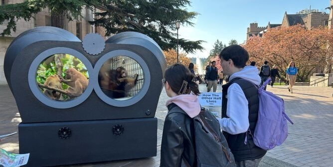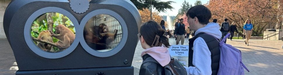 Our 7-foot-tall “binoculars” traveled to the Oregon university’s campus, the state capitol, and other locales to let people contrast monkeys living happily in their natural homes in one lens with a close-up view of the privation they endure in laboratory cages through the other. Over Portland’s busiest freeway, our neon sign lit up the night with a searing demand: “CLOSE OHSU MONKEY LAB.” Powerful ads saturated the airwaves, informing millions of viewers about what PETA’s undercover investigations of the primate center had found, including shrieking babies torn from their mothers, monkeys scalded to death by a cage-cleaning system, and other cruelty.