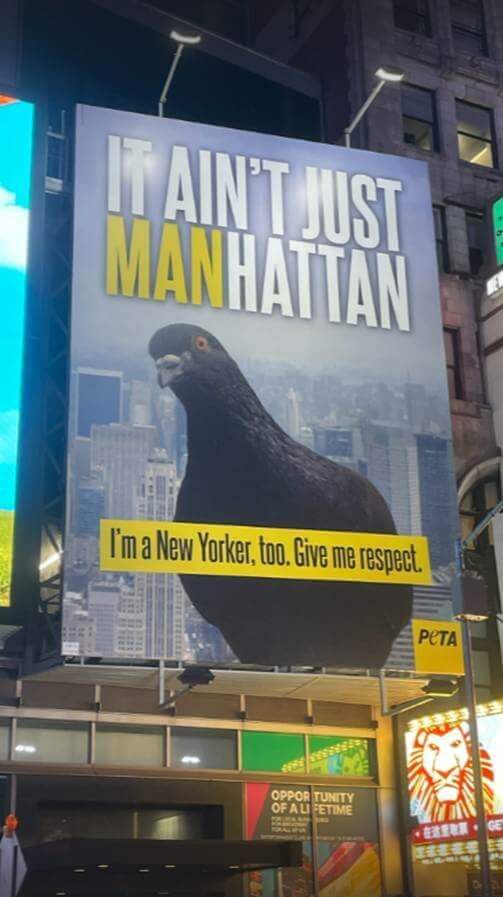 PETA unfurled this sky-high message just underneath Dinosaur – a wonderful statue of a noble pigeon in New York – to encourage passersby to peacefully coexist with these often-maligned birds.