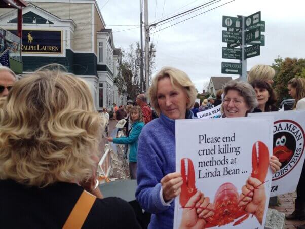 A passerby at PETA’s Linda Bean Main Lobster engaged in a thought-provoking conversation with Ingrid Newkirk.