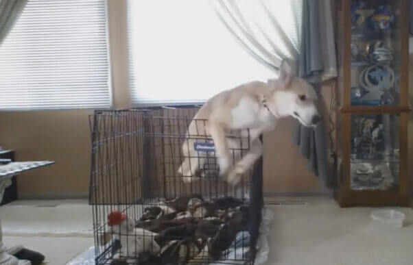 That’s Molly, one of the many dogs you can see online finding creative ways to escape their prisons – or desperately trying to, contorting themselves, digging, bending, or even overturning the crate – while their humans are away. Maybe your dog is more passive, but NO dog “loves” her little metal box. If she runs back to her jail cell, it’s a sign of conditioning, not “Yippee! I’m getting locked up again.” And if there’s a fire, a flash flood, or a burglary, that’s that, isn’t it, if she isn’t able to “Molly” out.