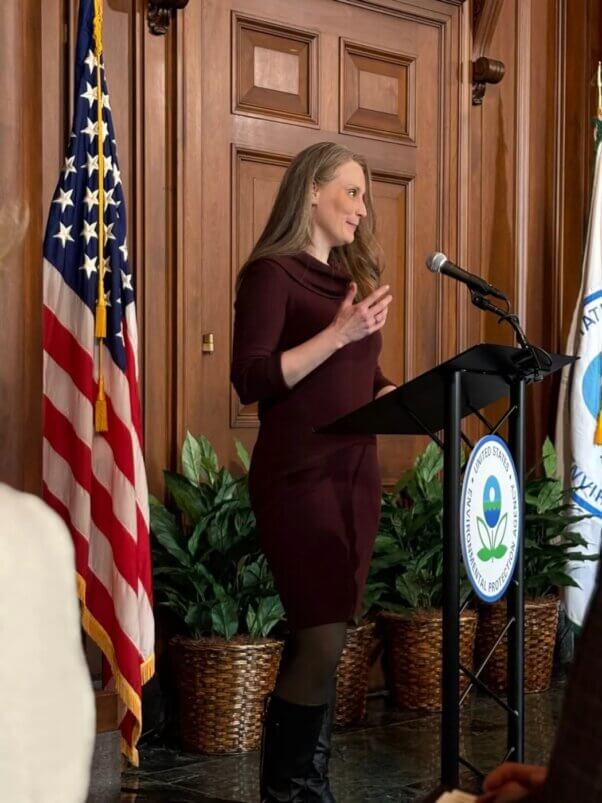But in the past decade, the EPA began seeing PETA scientists as a valuable resource. That led to coauthored papers, training for regulators, and, together, developing and evaluating state-of-the-art, animal-free test methods. PETA began siding with the EPA, defending the agency against lawsuits from vested interest groups trying to force it to increase unreliable animal tests that run counter to modern science. So when EPA Administrator Lee Zeldin announced the agency’s commitment, PETA’s Managing Director of Regulatory Toxicology Dr. Amy Clippinger didn’t just have a seat at the table – she had a spot at the podium.