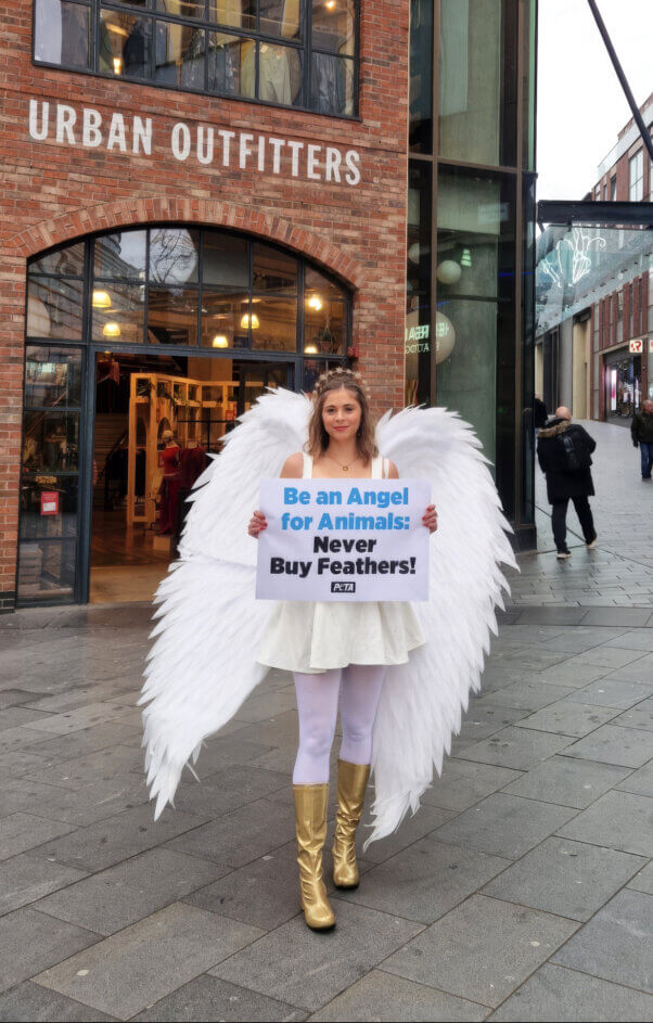 Show off your feather-free flair! Pledge never to buy or wear birds’ stolen feathers, and pass this information on to everyone you know. Also, visit PETAApprovedVegan.com and PETAShoppingGuide.com to see what to choose instead.
