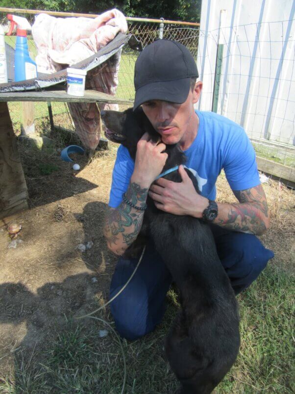 As a PETA fieldworker since 2015, Klug works to improve the lives of neglected animals in impoverished rural areas near PETA’s headquarters in Norfolk, Virginia, providing chained dogs without adequate protection from the elements with sturdy custom-built wooden doghouses, cleaning and filling algae-covered and empty water buckets, providing food for famished dogs whose “owners” often just throw old kibble or scraps on the ground, treating flea and tick infestations, medicating ears bloodied from fly-strike, and more. These dogs include Rusty, a senior dog who was kept tethered outdoors 24/7 for nearly a decade.