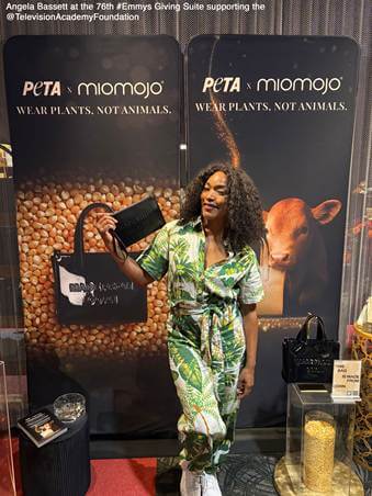 PETA and vegan handbag designer Miomojo were backstage at the exclusive Emmys® Giving Suite at The Peacock Theater in Los Angeles this weekend inspiring Emmy presenters, nominees, and winners to wear plants—not animals. During the rehearsal days as well as during Television’s Biggest Night, Emmy winners Katherine LaNasa and Philip Barantini as well as Aimee Lou Wood, Angela Bassett, Bowen Yang, Elizabeth Banks, Patricia Arquette, Ryan Murphy, Tony Goldwyn, and Uzo Aduba were among the stars who selected a Hollywood-worthy, Italian-crafted Miomojo handbag made from apples, corn, or olives.