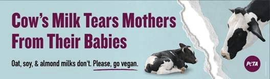 “Cow’s milk tears mothers from their babies.” That’s the message PETA is driving home to incoming crowds of New York State Fair attendees, plastering buses and bus shelters throughout Syracuse and other upstate cities that fairgoers may be traveling from, with a blitz of appeals urging viewers in one of the top dairy-producing states to leave cows in peace by choosing delicious vegan milks made from soy, oats, almonds, or other plants.