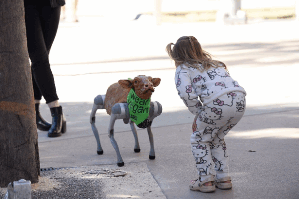 Bakersfield shoppers are in for a sci-fi spectacle on Thursday when a walking, talking, AI-powered robot calf named Charli XC Cow will hoof it to downtown Bakersfield to ask leather-clad customers outside, “Are you wearing my mother?” The robot, which features a state-of-the-art 3D-printed head, will describe how cows suffer mutilations and violent killings in the leather industry—and also break into a celebratory dance whenever someone proclaims they’re wearing shoes, clothing, or accessories made of vegan leather.