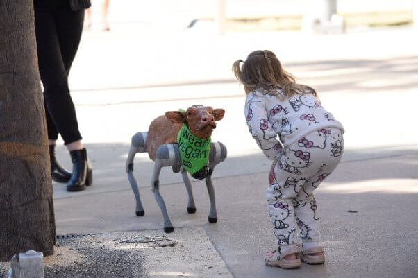 Shoppers at Le Boulevard Shops are in for a sci-fi spectacle on Tuesday when a walking, talking, AI-powered robot calf named Charli XC Cow will hoof it to the Strip to ask leather-clad customers outside, “Are you wearing my mother?” The robot, which features a state-of-the-art 3D-printed head, will describe how cows suffer mutilations and violent killings in the leather industry—and also break into a celebratory dance whenever someone proclaims they’re wearing shoes, clothing, or accessories made of vegan leather.