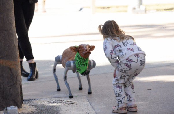Bricktown Canal shoppers and sightseers are in for a sci-fi spectacle on Tuesday when a walking, talking, AI-powered robot calf named Charli XC Cow will hoof it to the waterfront district’s stores to ask leather-clad customers outside, “Are you wearing my mother?” The robot, which features a state-of-the-art 3D-printed head, will describe how cows suffer mutilations and violent killings in the leather industry—and also break into a celebratory dance whenever someone proclaims they’re wearing shoes, clothing, or accessories made of vegan leather.