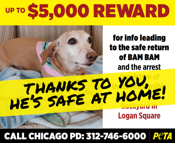 PETA is celebrating the news that Bam Bam is safe and sound and at home, and the billboards reminding everyone of our $5,000 reward for Bam Bam’s return will now thank everyone who came together to hand out flyers, contribute to the reward, and pound the pavement in search of this beloved little dog. Working for this reunion brought out the best in the community, and it reminds us all to never be silent, as speaking up when an animal is in danger can save a life.
