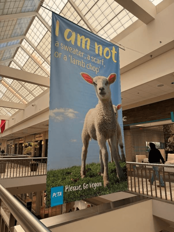 PETA’s pro-animal protection ad targeting wool at Walden Galleria in Cheektowaga. The ad has since been taken down by the mall’s owner and operator, Pyramid Management Group.