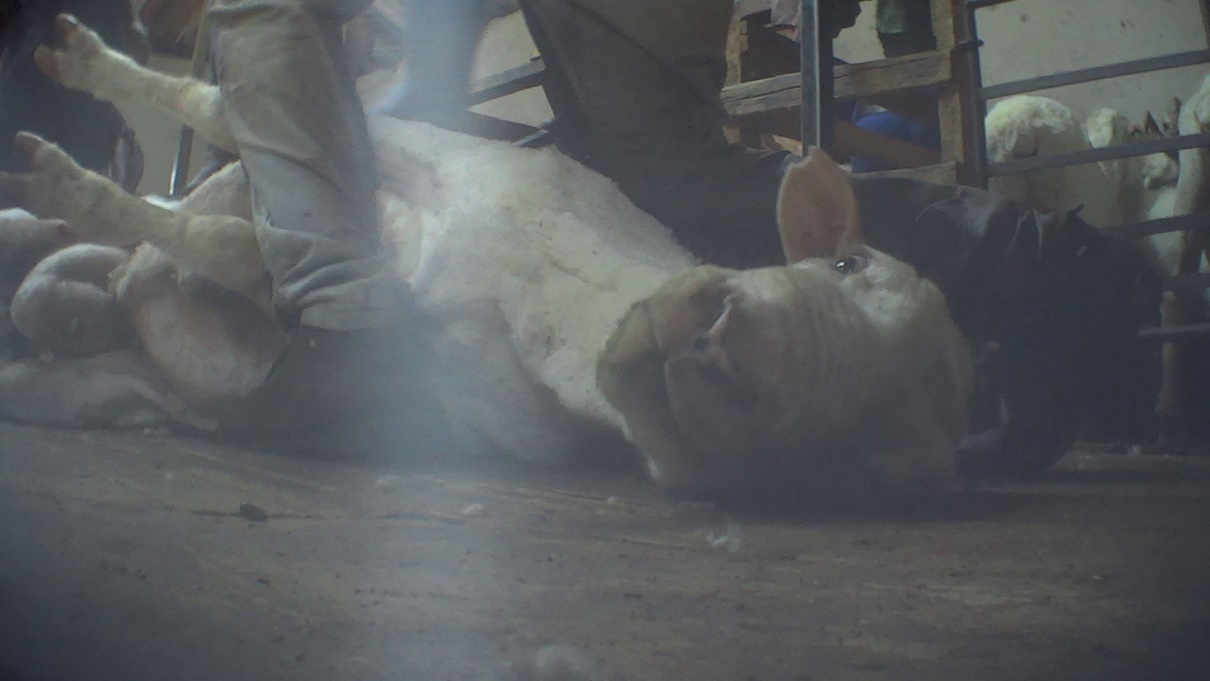 In the disturbing video, workers can be seen kicking sheep in the head and body, hitting them in the face with shearing equipment, beating them with a piece of wood, and picking up and dragging lambs by their front legs. One worker dropped his knee onto a ram’s neck, hitting the animal’s head on the floor. Others sheared the sheep quickly and carelessly, slicing their skin and leaving them bloody in the process. The investigator documented a dead lamb on the farm and a lamb with a maggot-infested wound, which the farmer reported was due to a jackal bite. The farm is also certified by the misleadingly named Responsible Wool Standard.